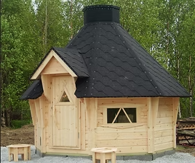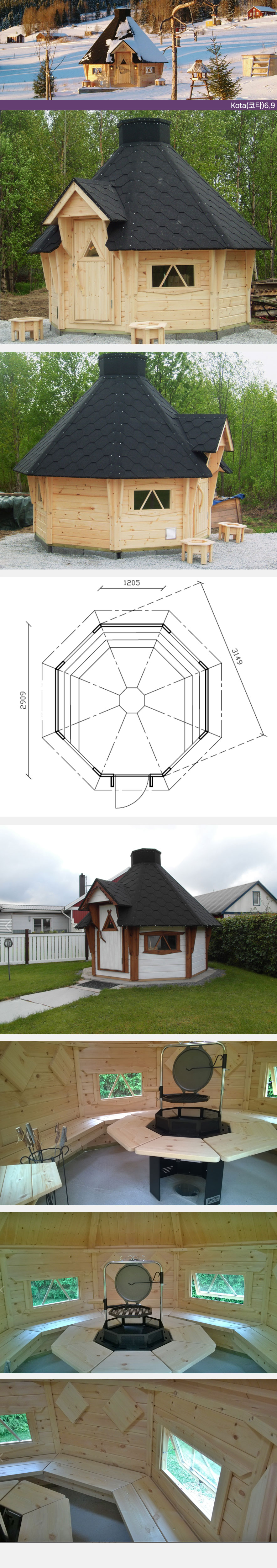 핀란드에서 가장 오래되고 전통 있는 오두막 제조 업체 타이마퓨 사의 제품입니다. 내부 바베큐 그릴 또는 사우나용 우드버닝으로 선택 가능하며 가든 하우스, 방갈로, 바베큐하우스, 작은 도서관, 작은 음악실, 작업실 등으로 활용 가능합니다. 실내는 벤치부터 순록 털, 나무 컵 등의 작은 악세사리 들까지 모두 풀세트로 되어 있는 국내에서는 절대 볼 수 없는 오두막입니다.